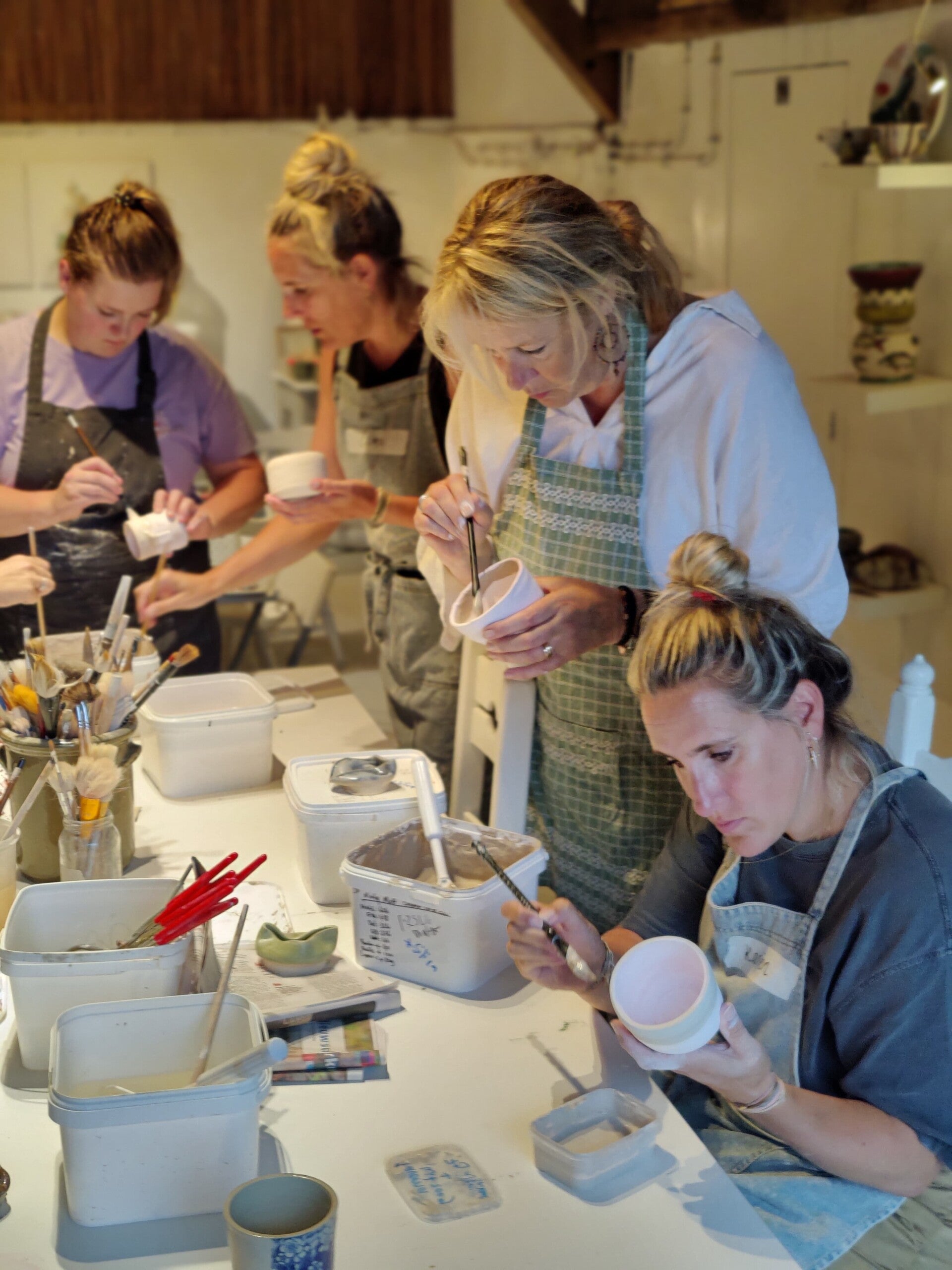Er mogen geen luchtbellen in de klei achterblijven. Als er luchtbellen in de klei blijven zitten, gaat het werkstuk kapot in de oven. Glazuren is ook handwerk. We weten ongeveer hoe het eruit gaat zien, aan de hand van de proefjes, maar het resultaat kan na het bakken ook wel eens anders uitvallen.