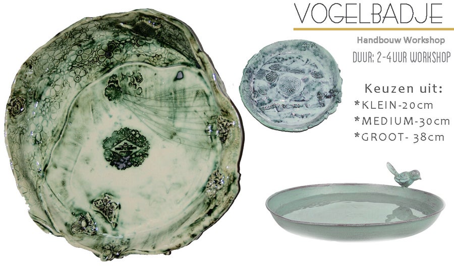Design en maak een persoonlijke vogelwaterbak voor in de tuin. We starten eerst met tekenen van een design. Planning van de vorm. Ik geef dan een uitleg over verschillende opbouw technieken zoals slab & coil & knijp potjes. We gebruiken mallen, stempels, textiel om oppervlakte technieken. Dan decoreren met oxides. U mag een glazuur uit kiezen voor u werkstuk.